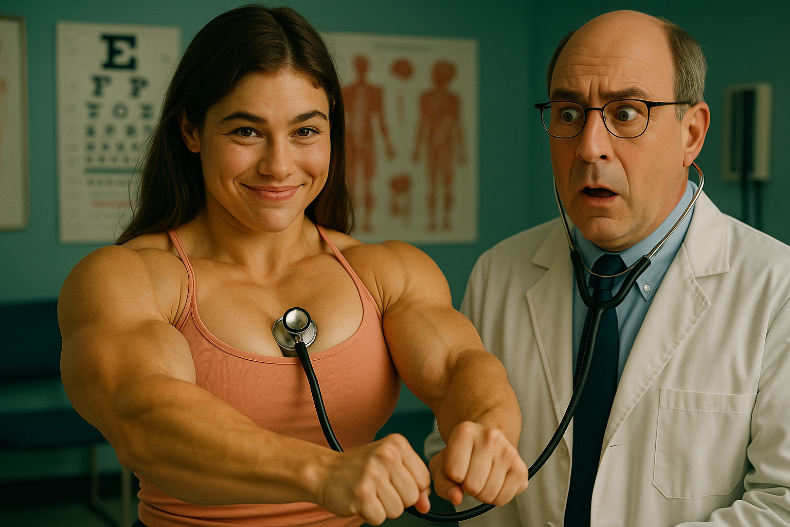 Stacy sat down on the cold examination table. The paper crinkled and tore beneath her as her thighs spread, impossibly thick and powerful, dense with muscle. Her tank top strained across her chest with every breath. The cold room made her nipples harden.